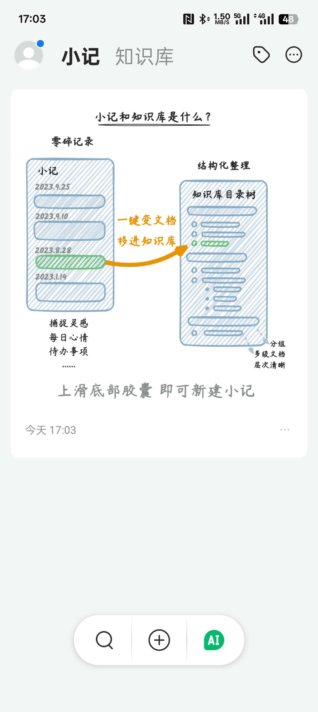 语雀小记是你的个人笔记备忘录,随时随地记录你的想法、灵感和事项。
