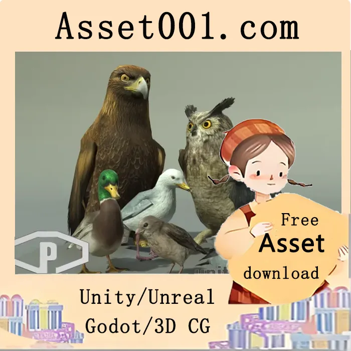官网自营 unity资源 Unity 3D-Models 2026-02-20 00:00:00 Unity鸟兽资源包:包含7种鸟类模型及PBR/legacy着色器支持|BIRDS PACK v2.1 BIRDS PACK v2.1 是一个包含7种鸟类模型的高质量游戏资源包,涵盖乌鸦、鸭子、金鹰、大角鸮、鸽子、海鸥和麻雀。该资源包支持PBR与Legacy着色器,并提供实时动画与根运动功能,所有角色骨骼均采用Mecanim通用配置,适用于多种游戏项目场景,可高效集成至现有开发流程中。 鸟动画纹理3D模型