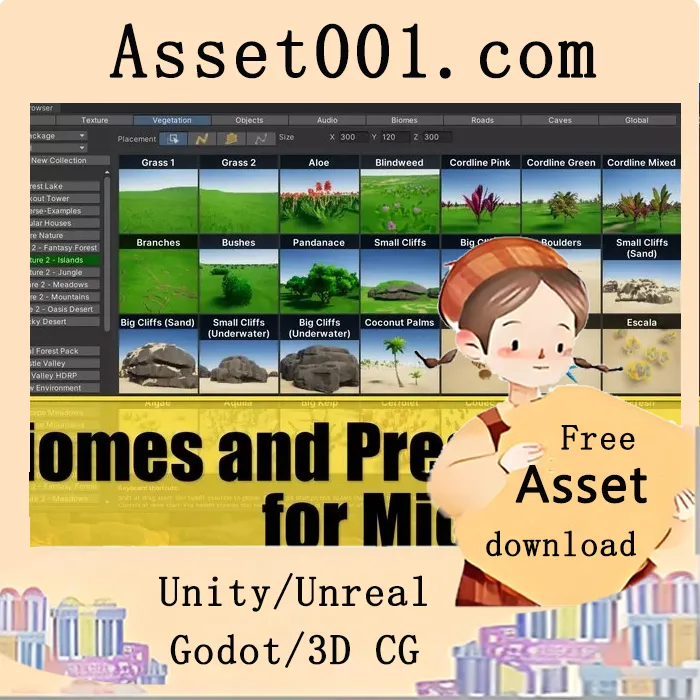 资源包包含 Biomes and Presets 1 与 2 的全部内容,用户购买后需在 Unity Asset Store 中手动将这两部分资源绑定至账户,系统将自动识别为已购买或可免费升级。资源覆盖多个版本的主流资产,包括 BK、Pure Nature 2、Quad Art、Polyart Studio、Vivid Arts、Seta、Philipp Schmidt、Asset Maiden、Sandro T、Wave Harmonic、Crest Water 5、Raygeas、ALP 等知名创作者的环境包,涵盖森林、沙漠、草原、山地、湖泊、村庄、城堡、奇幻地形等多种主题。