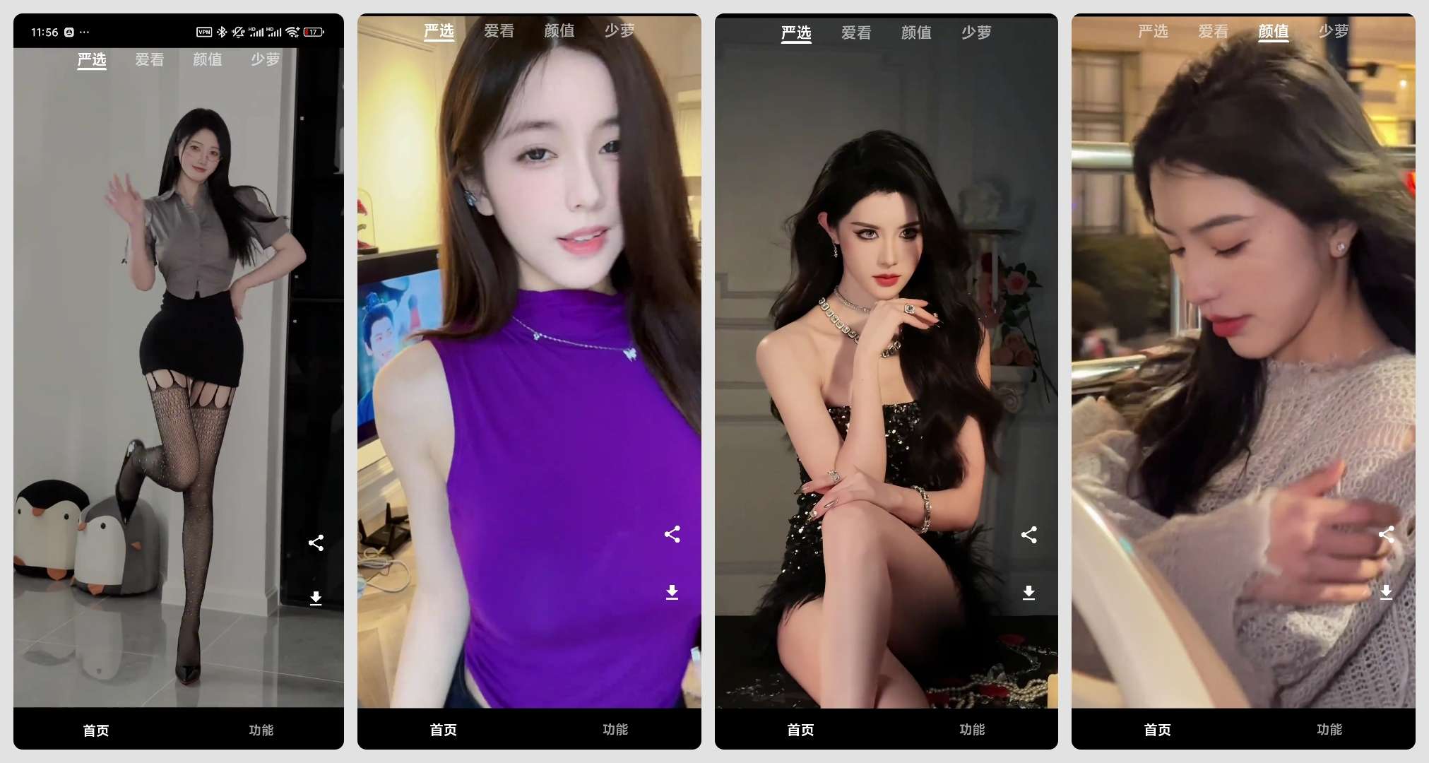 看看侠是一款非常全面的看美女视频的应用程序。它聚合了抖音、快手等平台上的最新美女视频内容,用户无需注册即可直接观看。该应用精心挑选了包括少萝、颜值、严选和爱看在内的四大分类,满足不同用户的观看需求。
